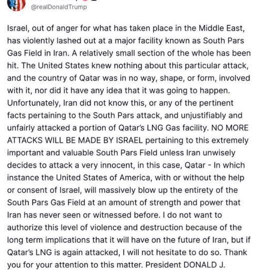 🌴 Το Ισραήλ βομβάρδισε ένα κοίτασμα φυσικού αερίου στον Περσικό κόλπο, το South Pars, το οποίο συνεκμεταλλεύονται το Ιράν και το Κατάρ.