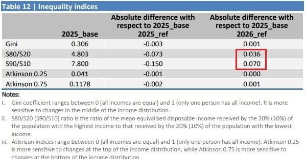 Δεν αποτελεί έκπληξη συνεπώς ότι η ανισότητα αναμένεται, σύμφωνα με την ίδια την κυβέρνηση, να αυξηθεί. Όπως φαίνεται στους δείκτες S80/S20 και S90/S10 o λόγος στο μερίδιο εισοδήματος των πλουσιότερων στρωμάτων σε σχέση με τα φτωχότερα αλλάζει προς όφελος των πλουσιότερων.