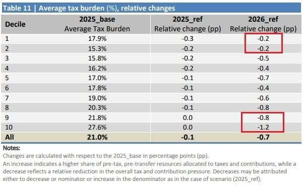Η ελάφρυνση από το φορολογικό βάρος του φτωχότερου 20% (δηλαδή τα πρώτα δύο δεκατημόρια) είναι μόλις 0,2 ποσοστιαίες μονάδες, ενώ το πλουσιότερο 20% του πληθυσμού (δηλαδή τα δύο τελευταία δεκατημόρια) θα δει μειώσεις από 0,8 έως 1,2 ποσοστιαίες μονάδες