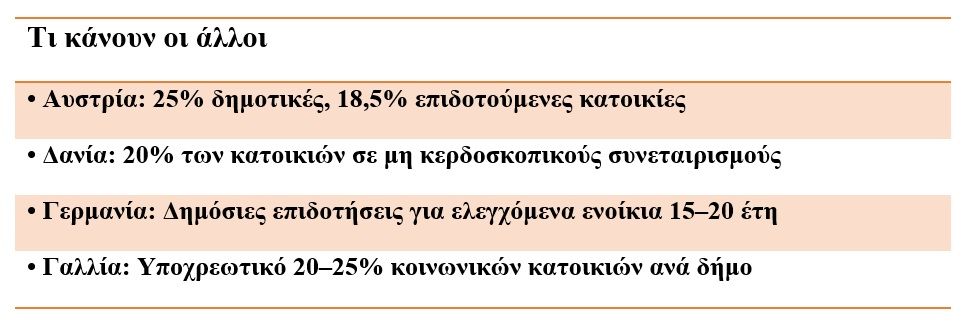 Μια σύγκριση με τι γίνεται διεθνώς δείχνει το χάσμα που μας χωρίζει. Στην Ευρώπη για να διατηρηθούν χαμηλά οι τιμές το κράτος δίνει συχνά επιδοτήσεις στην κατασκευή για να κρατηθούν χαμηλά τα ενοίκια, ενώ συνήθως τη διαχείριση των κοινωνικών κατοικιών την αναλαμβάνουν μη κερδοσκοπικές επιχειρήσεις, συνεργατικά ή συνεταιριστικά εγχειρήματα. Από αυτά δεν κάνει τίποτα η Κυβέρνηση.