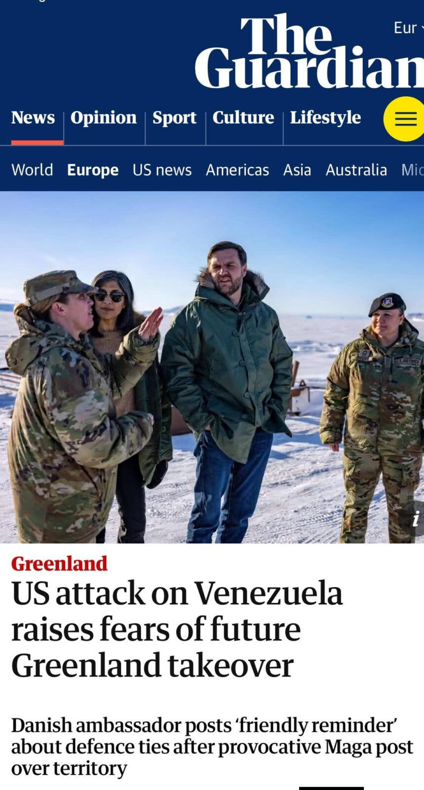 Λίγες ώρες μετά την αμερικανική επίθεση στο Καράκας, η δεξιά παραγωγός podcast, Katie Miller, σύζυγος του αναπληρωτή επικεφαλής του προσωπικού για θέματα πολιτικής στον Λευκό Οίκο, ανάρτησε φωτογραφία του στη της Γροιλανδίας με σημαία των ΗΠΑ και επιγραφή “SOON”.