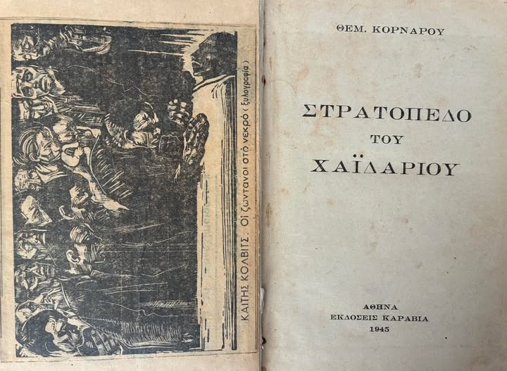 [φωτό: ο «Νικολάκης» Δημητράκας ήταν κρατούμενος στο στρατόπεδο Χαϊδαριου. Επέζησε. Το 1945 αγόρασε το γνωστό βιβλίο του Θέμου Κορνάρου που αναφερόταν στη συλλογική εμπειρία του εγκλεισμού. Δηλαδή σε αυτό που είχε ζήσει. Έκοψε από τον -νόμιμο- Ριζοσπάστη το χαρακτικό της -γερμανίδας αντιφασίστριας- Käthe Kollwitz κ το κόλλησε στο εσώφυλλο]