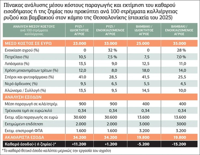 Μια πρόσφατη συνοπτική ανάλυση του συνολικού κόστους και εκτίμηση του καθαρού εισοδήματος ή της ζημίας για την καλλιέργεια ρυζιού και βαμβακιού στον κάμπο της Θεσσαλονίκης, για το 2025, δίνεται στον συνημμένο πίνακα και αναδεικνύει ότι το κόστος του πετρελαίου κυμαίνεται σε 8-11%, των λιπασμάτων, σπόρων και φυτοφαρμάκων σε 35-53% και της χρήσης μηχανημάτων για ραντίσματα και αλώνισμα σε 18-32%. Το συνολικό κόστος τελικά αποβαίνει ζημιογόνο ειδικά για ενοικιαζόμενους αγρούς και επιπλέον τελικό καθαρό έσοδο δεν καλύπτει την εργασία του αγρότη.