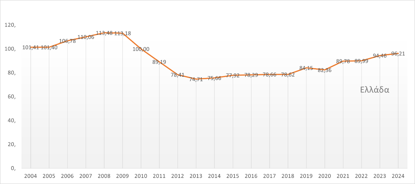 Η Ελλάδα βρέθηκε πιο ευάλωτη λόγω υψηλού δημόσιου χρέους, απουσίας παραγωγικής βάσης και των καταστροφικών πολιτικών λιτότητας – όπως παραδέχθηκε και το ίδιο το Δ.Ν.Τ. Η μεγάλη βουτιά ήρθε το 2009, όταν ο δείκτης πραγματικού εισοδήματος έπεσε από το 113,18 (το υψηλότερο σημείο) στον πάτο το 2013, με μόλις 74,71 μονάδες. Μετά από μια οριακή ανάκαμψη μεταξύ 2013 και 2018, η χώρα σημείωσε άλμα το 2019 (από 78,62 σε 84,15), όμως το 2024 παραμένει κάτω από τα επίπεδα του 2010 (96,21 έναντι 100).